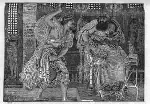 The Israelites sin. The LORD punishes them by sending Eglon, King of Moab. Eglon gets some allies of his to come with him and they beat up Israel. The Israelites cry out for help, and the LORD sends help for them. Enter Ehud, the assassin. Ehud is left-handed, and the king’s body guards don’t discover his weapon (probably because they didn’t bother to search his right side–his sword would be on opposite hand to make it easier to draw). Ehud asks for a private audience and Eglon grants it. Ehud stabs Eglon so hard that it sinks all the way into the portly man’s flesh. Leaving his blade behind, Ehud escapes and rallies the troops, who unite around their new leader. He then strikes ten thousand Moabites down with his army, and none escape.